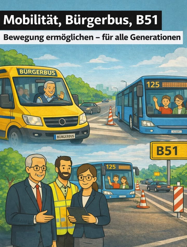 mehrMobilität, Bürgerbus, B51 Bewegung ermöglichen - für alle Generationen Die CDU engagiert sich seit Jahren für eine bessere Mobilität in Twistringen. Die Ausweitung der Buslinie 125 in die Abendstunden - besonders wichtig für Jugendliche - wurde auf CDU-Initiative umgesetzt. Auch der Bürgerbus, der mit viel Ehrenamt aufgebaut wurde, erhielt von Beginn an unsere Unterstützung.Bei der Sanierung der B51 setzte sich die CDU im Rat dafür ein, die Belastungen für Anwohner und Gewerbe möglichst gering zu halten. ??So entsteht Mobilität, die im Alltag funktioniert - mit einem Blick für das Ganze.#cdu #twistringen